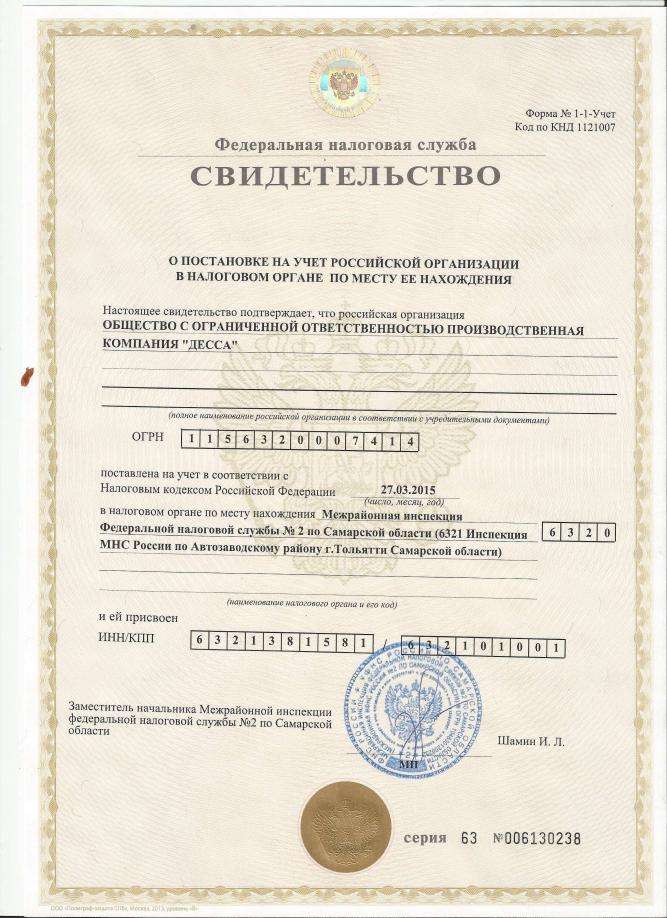 Свидетельство о постановке на учет в налоговом органе